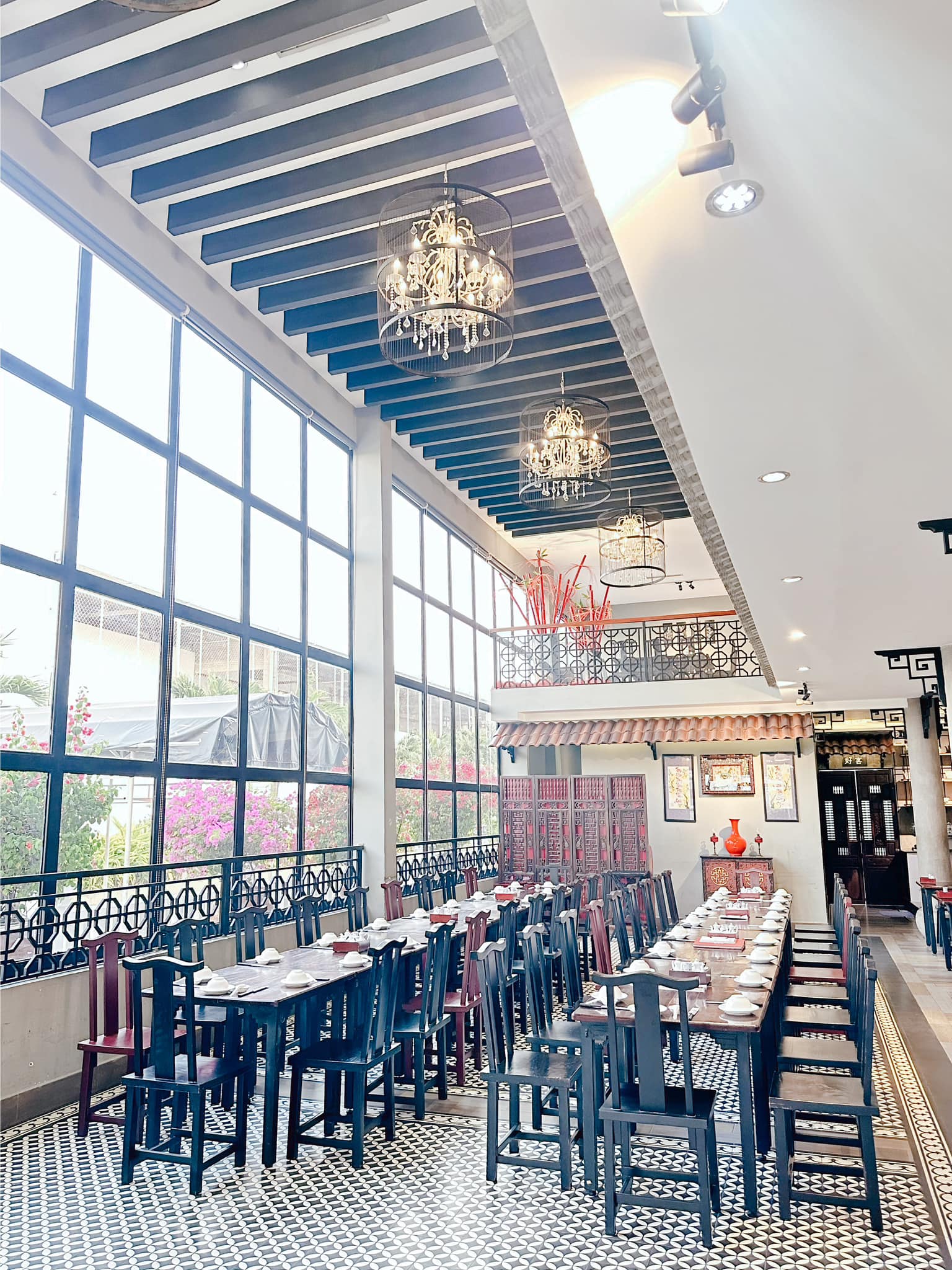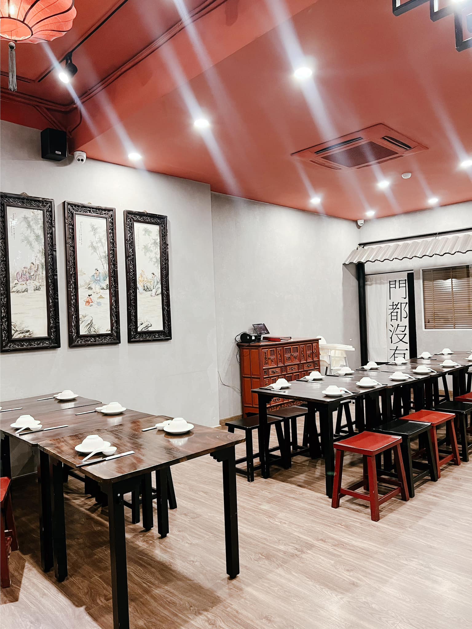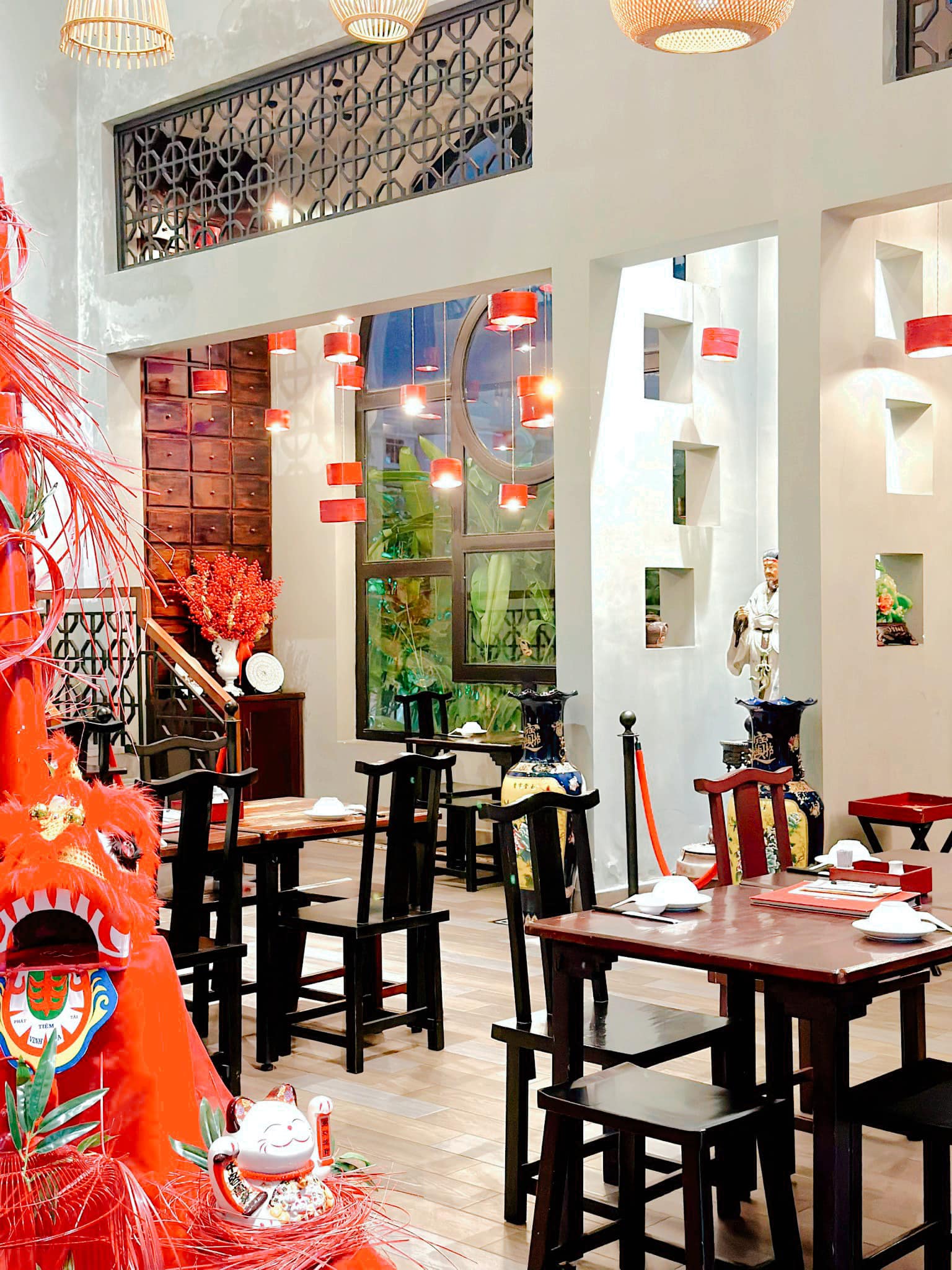 • Thiết kế đậm chất Trung Hoa, tông màu đỏ – vàng chủ đạo, kết hợp với đèn lồng treo trần và nội thất gỗ sang trọng.