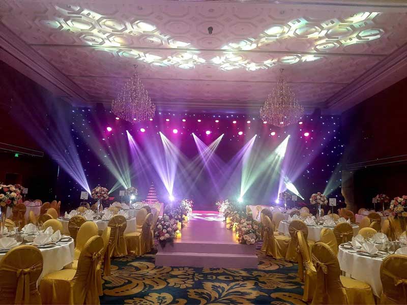 | 400 – 500 khách | 2 loa Verve 215, 6 sub, 4 loa monitor | 12 đèn Parled, 6 đèn Moving Beam, 1 đèn Follow 380 | 16.500.000 |
