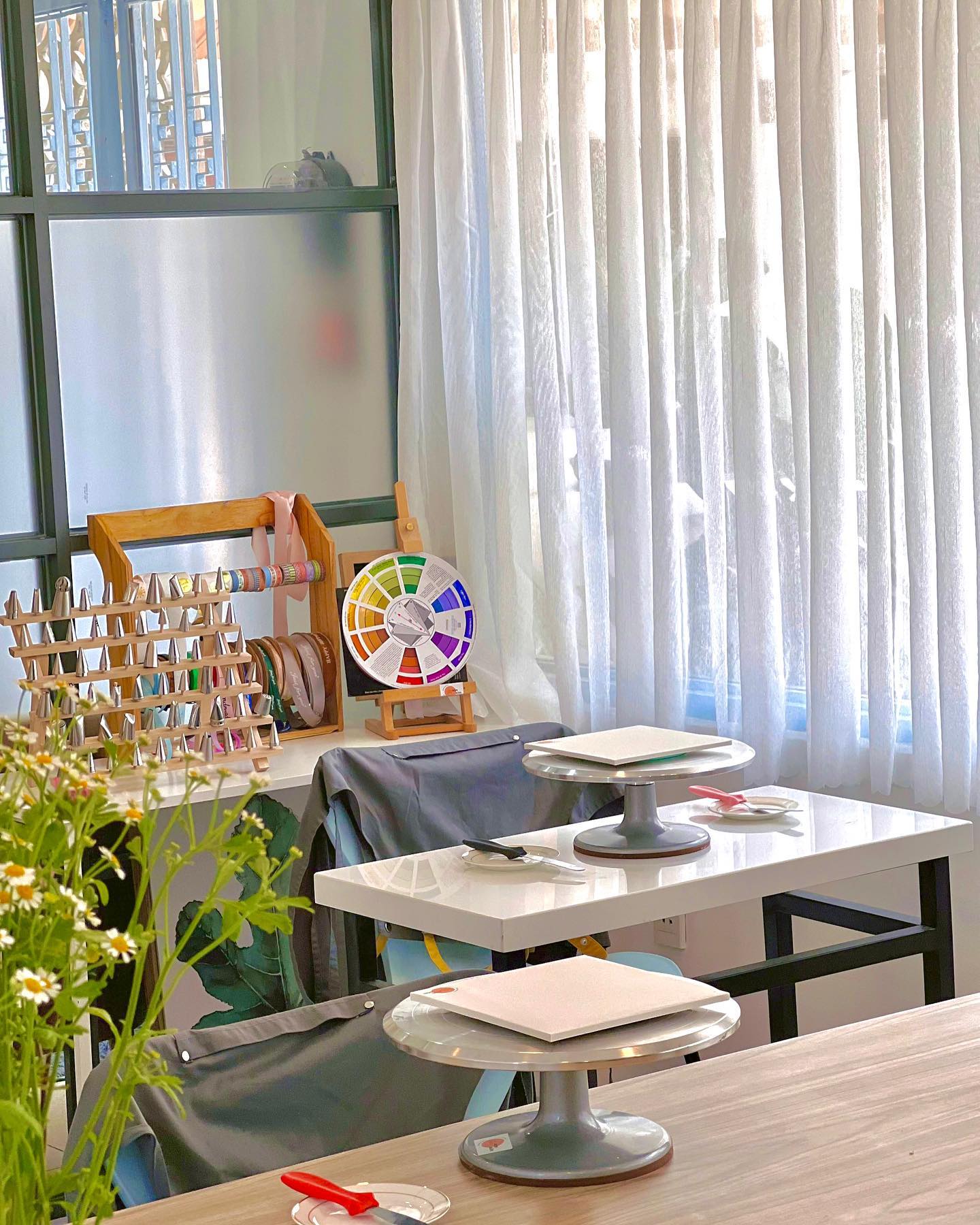 - Khu vực workshop chính: Được trang bị đầy đủ dụng cụ làm bánh chuyên nghiệp, với hệ thống bàn ghế rộng rãi, giúp người tham gia dễ dàng thao tác.