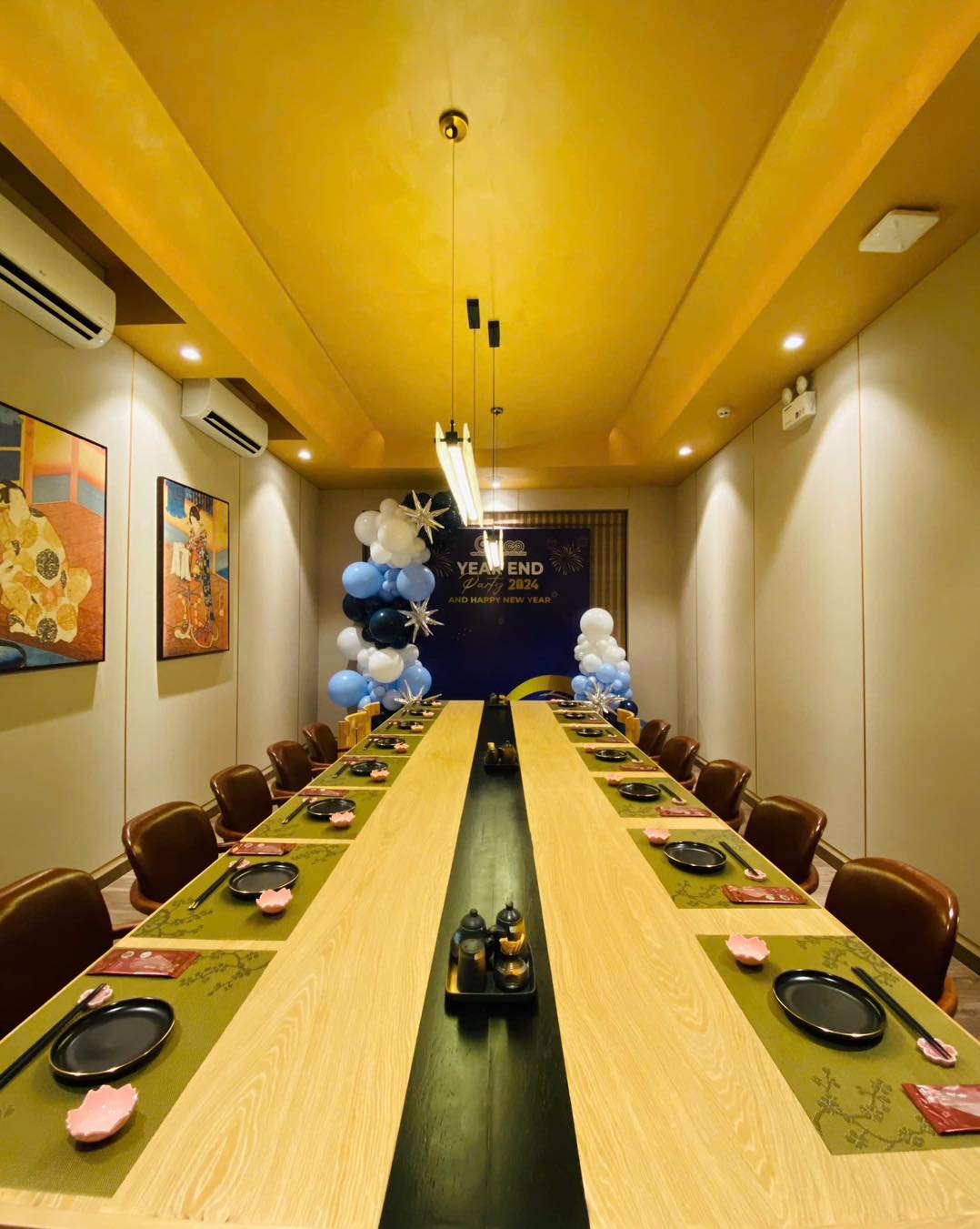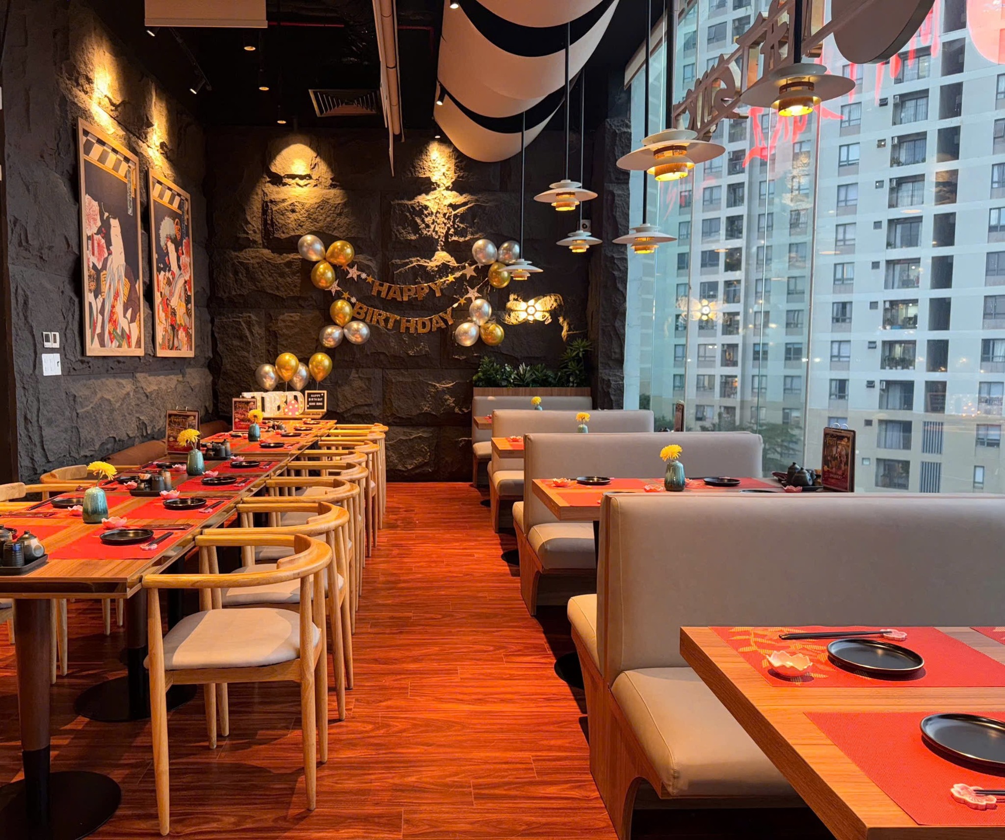- Thiết kế mang đậm phong cách Nhật Bản, từ bàn ghế gỗ đến đèn lồng, tranh treo tường tạo không gian ấm cúng, sang trọng.