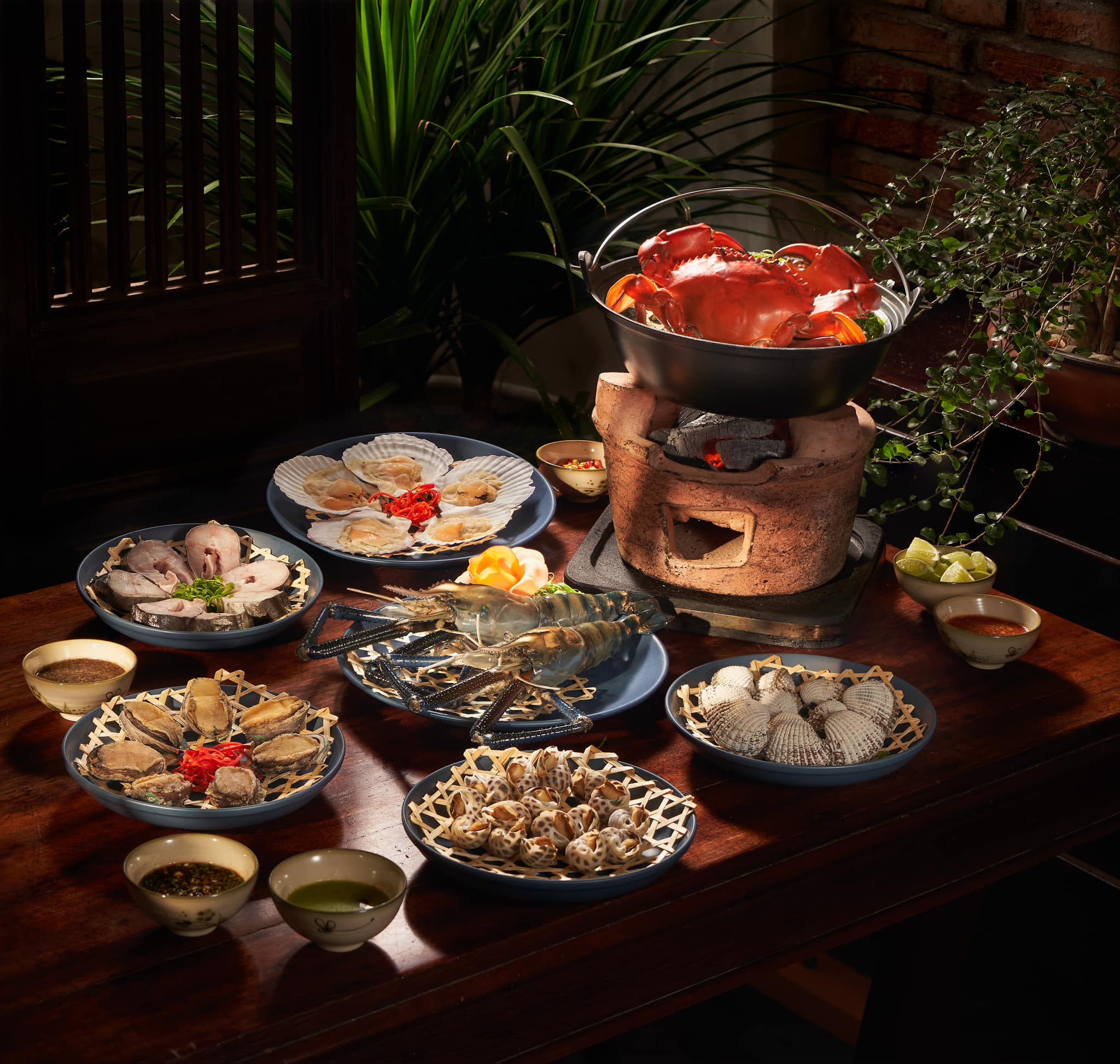 - Món ăn chuẩn vị Việt: Cơm niêu, cá kho, canh cua, rau luộc kho quẹt.