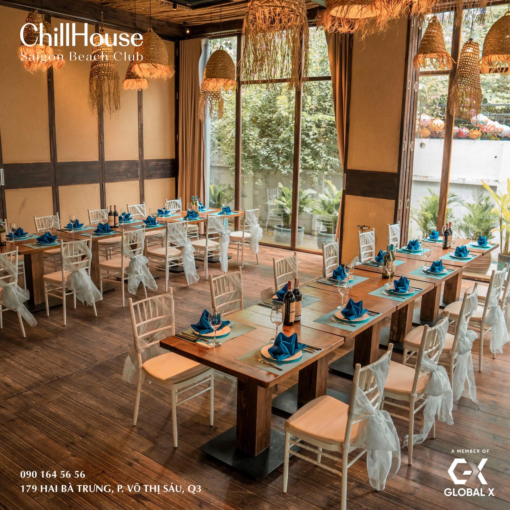 Saigon Beach Club – ChillHouse mang đến cảm giác nghỉ dưỡng ngay giữa lòng thành phố. Với thiết kế theo phong cách bãi biển Địa Trung Hải, nơi đây nổi bật bởi sự phóng khoáng và tươi mát, sử dụng nhiều gam màu trắng, xanh biển và các chi tiết trang trí lấy cảm hứng từ biển. Không gian được chia thành nhiều khu vực, từ các bàn ngoài trời thoáng đãng cho đến các góc chill ấm cúng bên trong. Các khu vực được bố trí hợp lý, tạo ra một trải nghiệm thú vị và dễ chịu cho mọi khách ghé thăm.