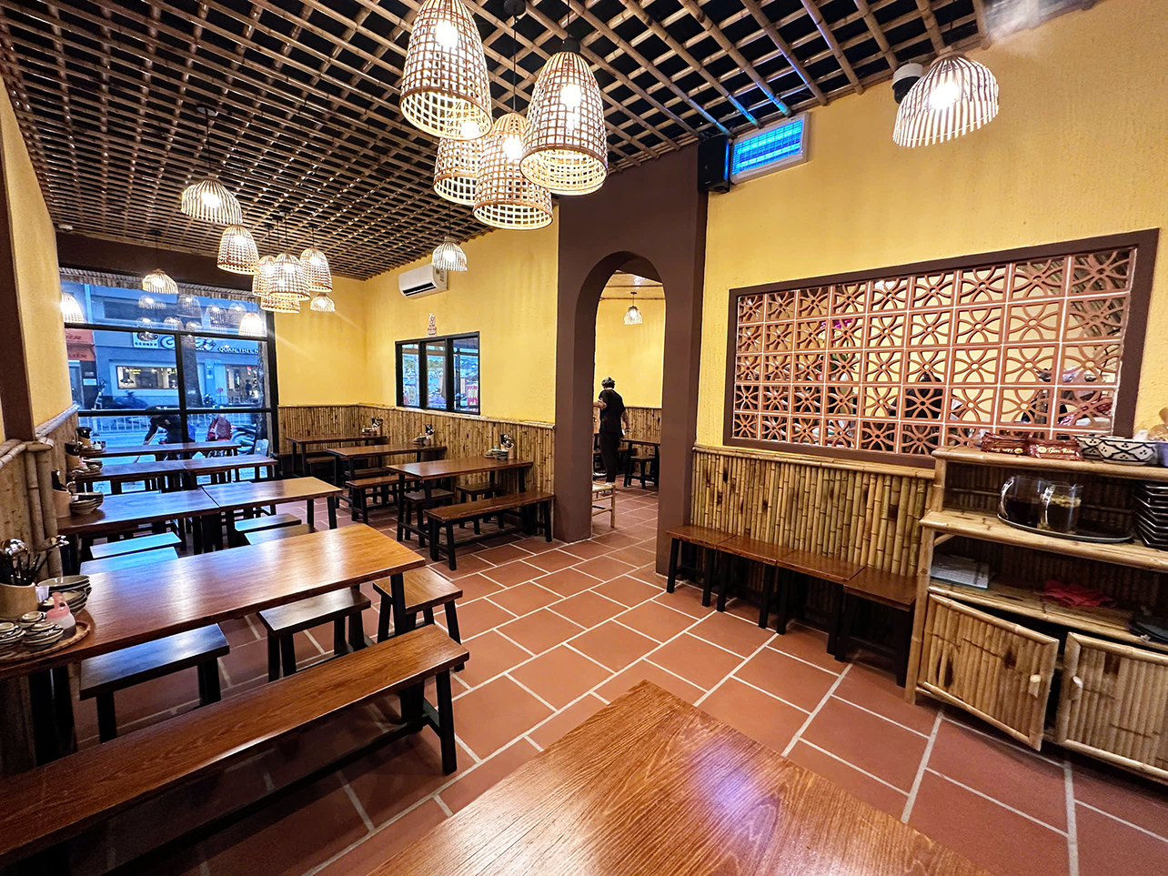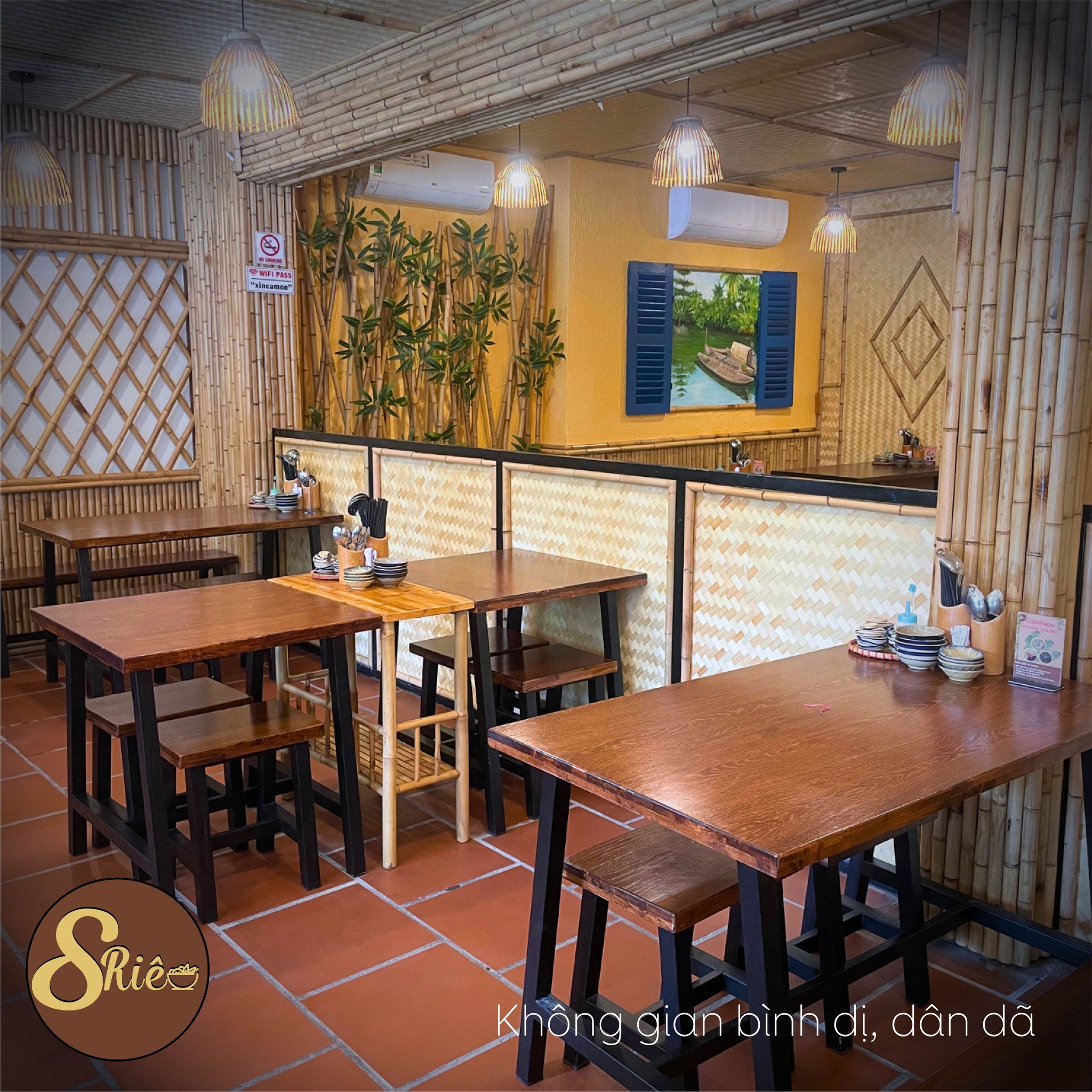 - Bàn ghế gỗ sạch sẽ, bài trí gọn gàng, tạo cảm giác thoáng mát và thư giãn khi thưởng thức món ăn.