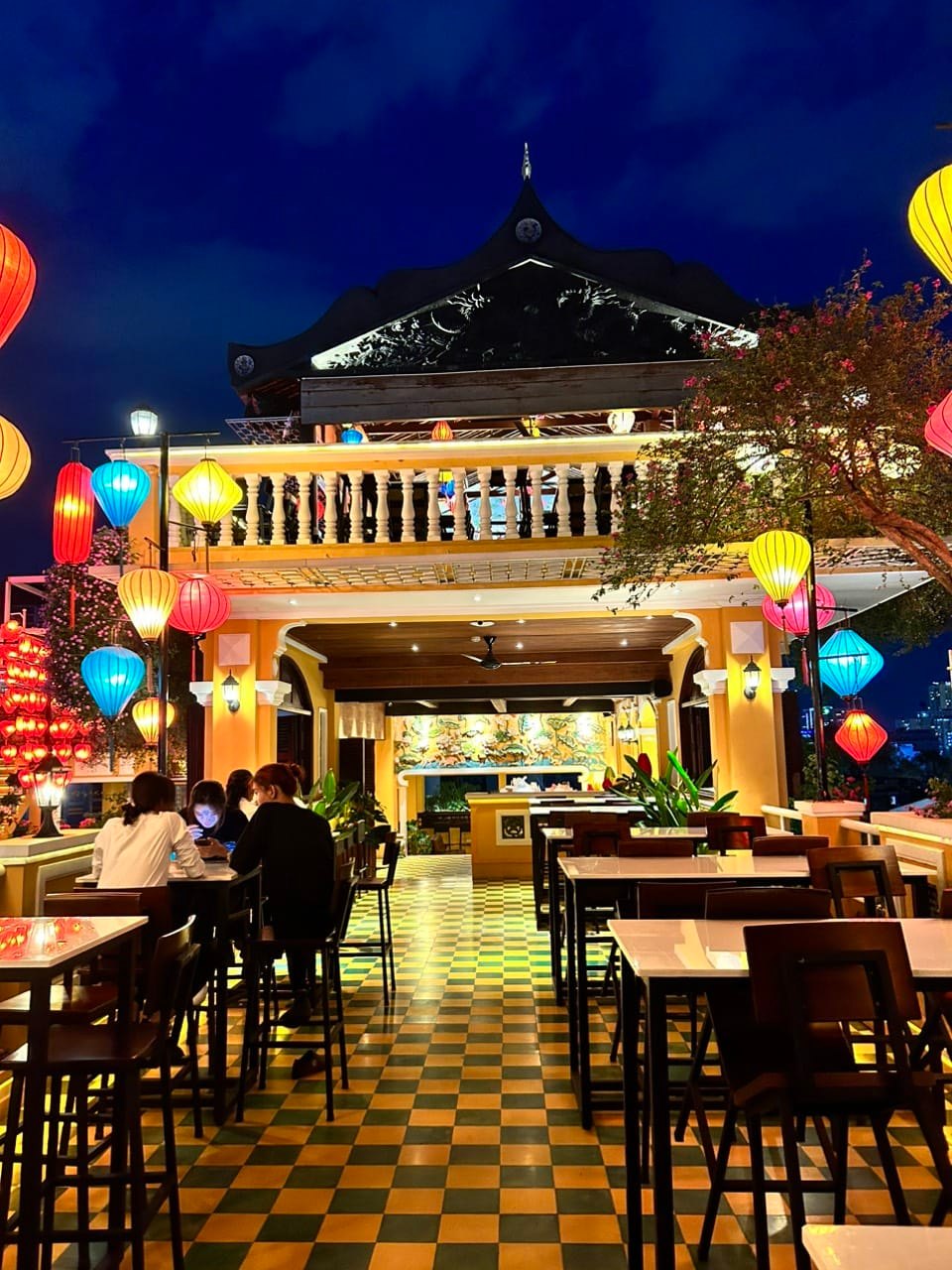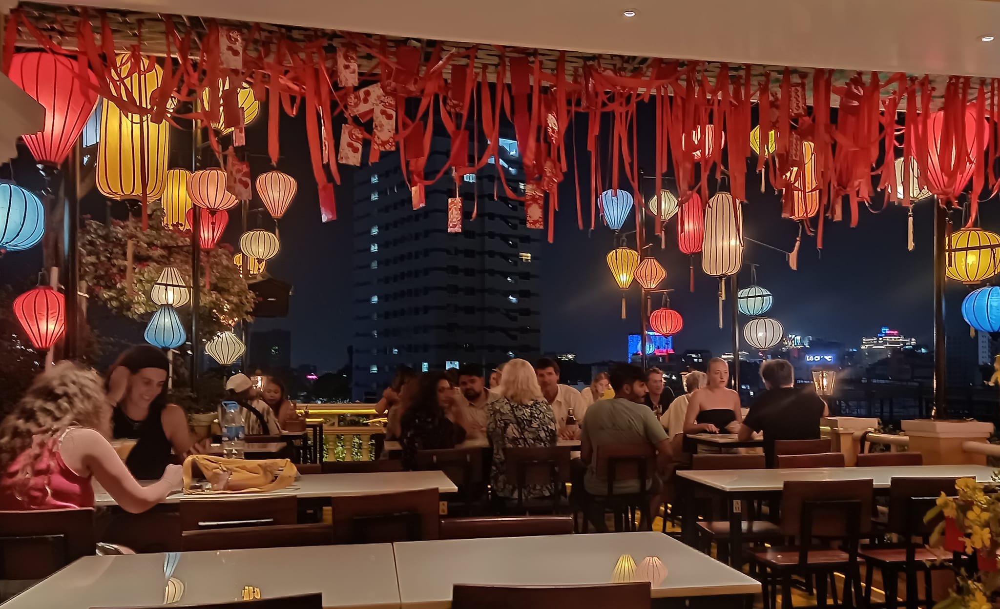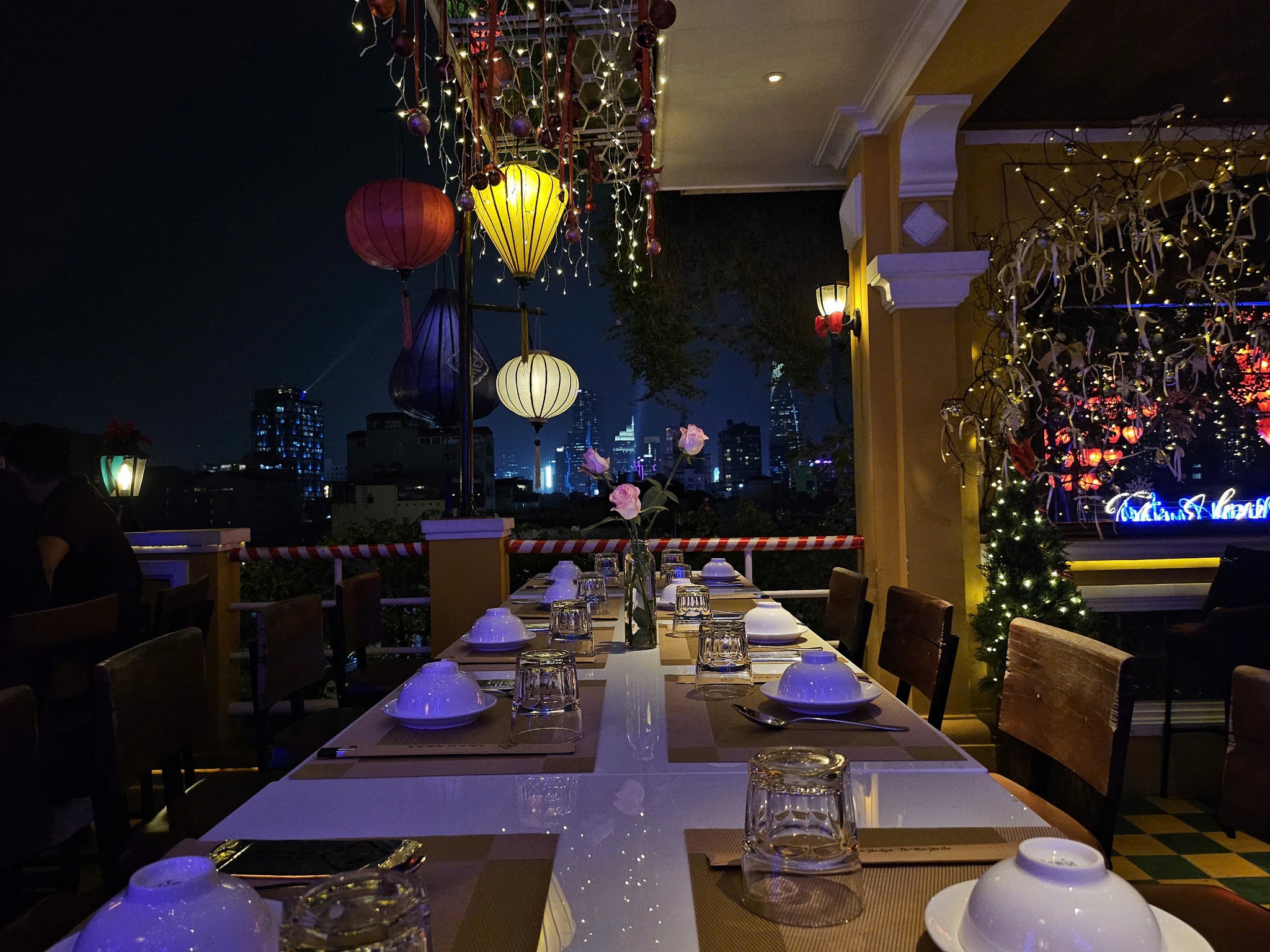 • Điểm nhấn nổi bật: Không gian được trang trí với ánh đèn dịu nhẹ và cây xanh bao quanh, tạo nên một bầu không khí vừa sang trọng, vừa gần gũi. Vị trí trên cao giúp thực khách tận hưởng làn gió mát cùng khung cảnh tuyệt đẹp vào ban đêm.